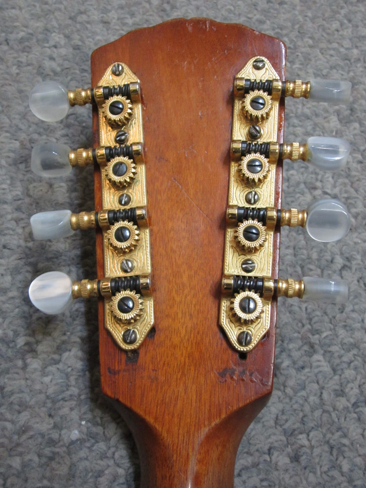 It is in excellent condition for a hundred year old instrument! There are no cracks, breaks or visible repairs. The tuners have been changed as can be seen. There is a second set of tuners which I don’t think are the originals (they may be, but I’m not positive). They seem to work well, I’m not sure why they were changed out.