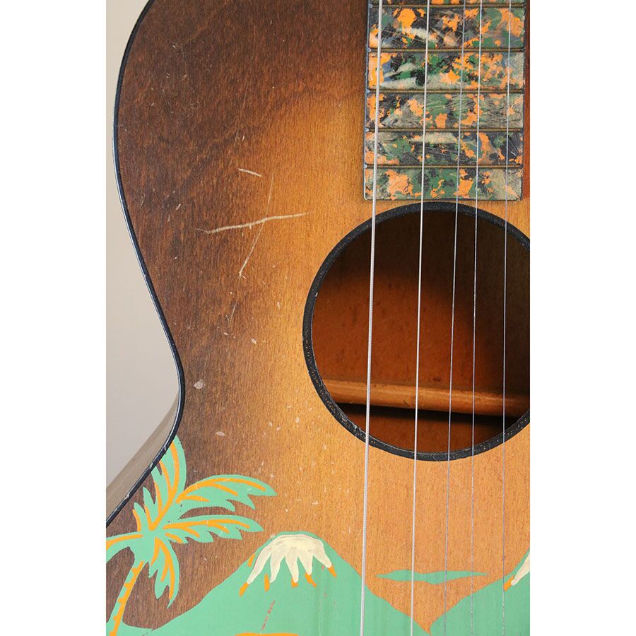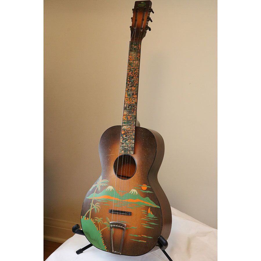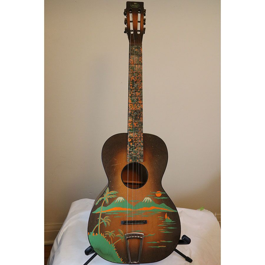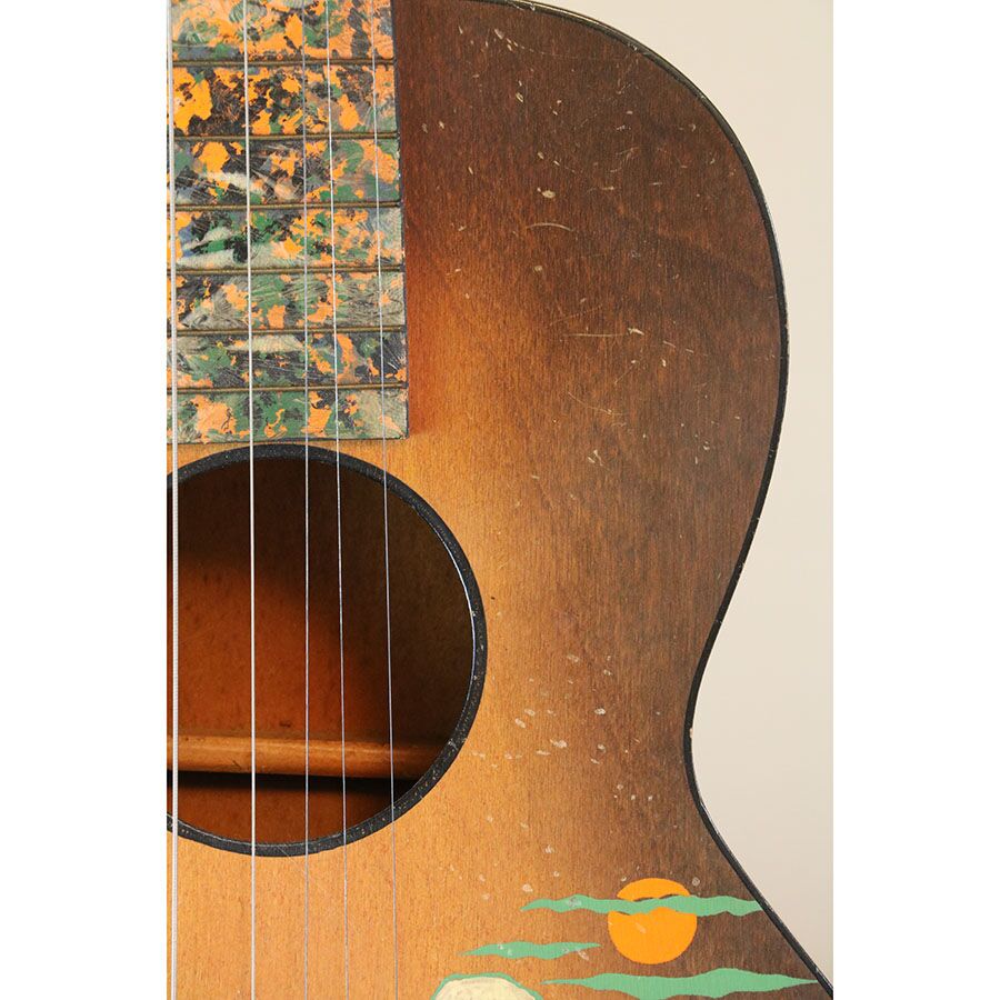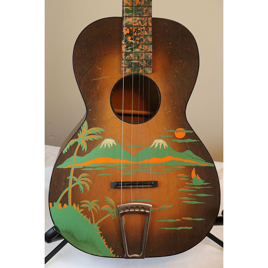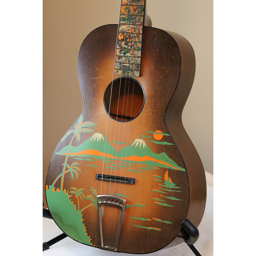 Here’s a rare, cool vintage B&J parlor stencil guitar! It’s a Serenader with what I believe is the “Buckeye” cowboy image on it.